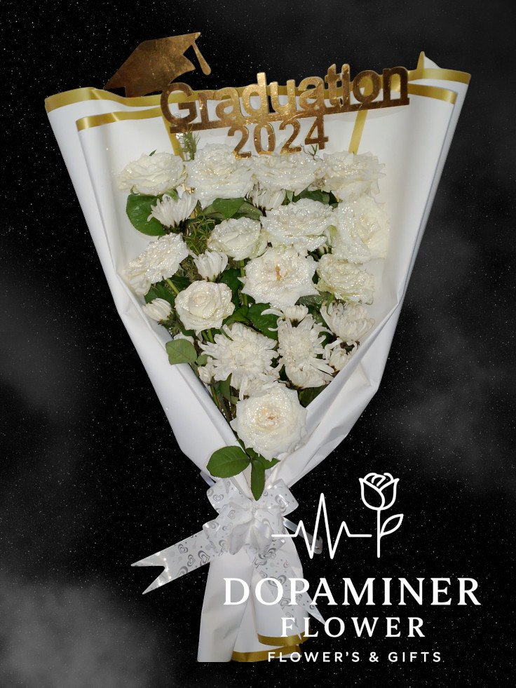 “احتفل بالتخرج بأناقة مع بوكيه فاخر من الورود البيضاء النقية، ملفوف بعناية في غلاف أبيض أنيق ومزين بتوبر التخرج. هدية مثالية لأي شخص يود التعبير عن الفخر والفرحة في هذا اليوم المميز. توصيل سريع في مصر لمناسبات التخرج والاحتفالات الخاصة.”