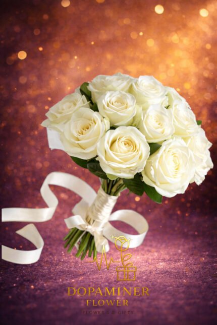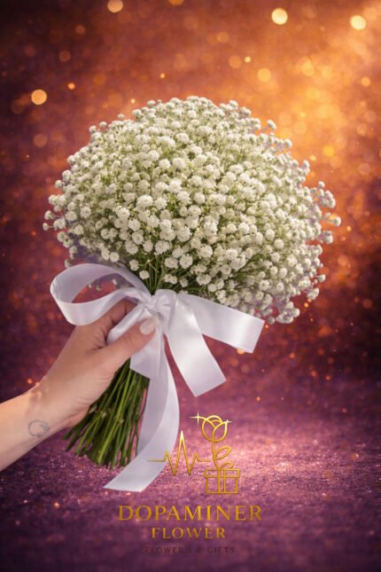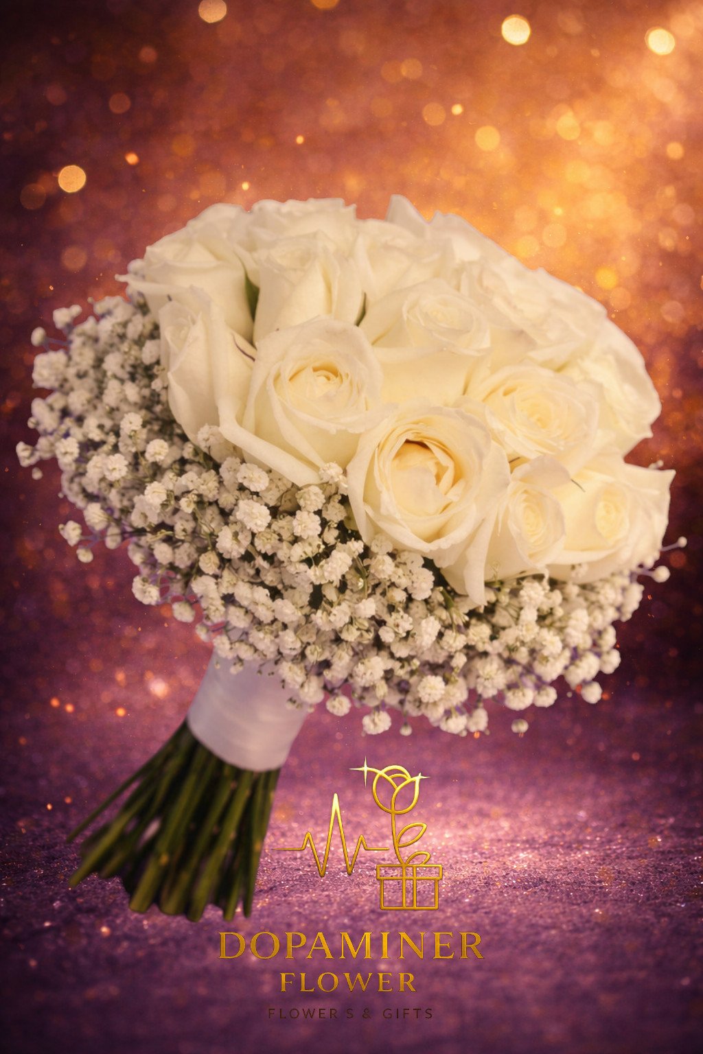 بوكيه زفاف أبيض مزين بزهور البيبي فلاور الناعمة، يجمع بين الرقة والرومانسية في تنسيق بسيط يضيف لمسة حالمة لإطلالة العروس.