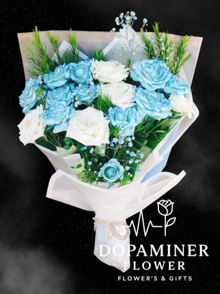 “بوكيه ورد هادي وجميل بالألوان الأبيض والسماوي، ملفوف في غلاف أبيض ناعم. الألوان المبهجة مصممة خصيصًا لإضافة لمسة إيجابية وتحسين