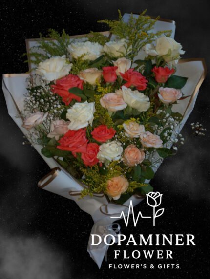 “بوكيه ورد فاخر يجمع بين الأبيض ودرجات الكشمير، الأورانج والسيمون، ملفوف في غلاف أسود أنيق. تنسيق الألوان المبهج والهادئ معًا