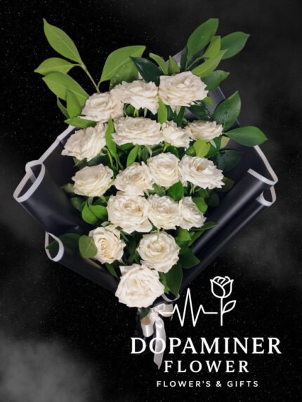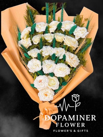 “بوكيه ورد بلدي طبيعي أبيض بالكامل، ملفوف بعناية في غلاف أبيض ناعم. تصميمه بسيط وأنيق، يبعث إحساس بالصفاء والهدوء ويضيف